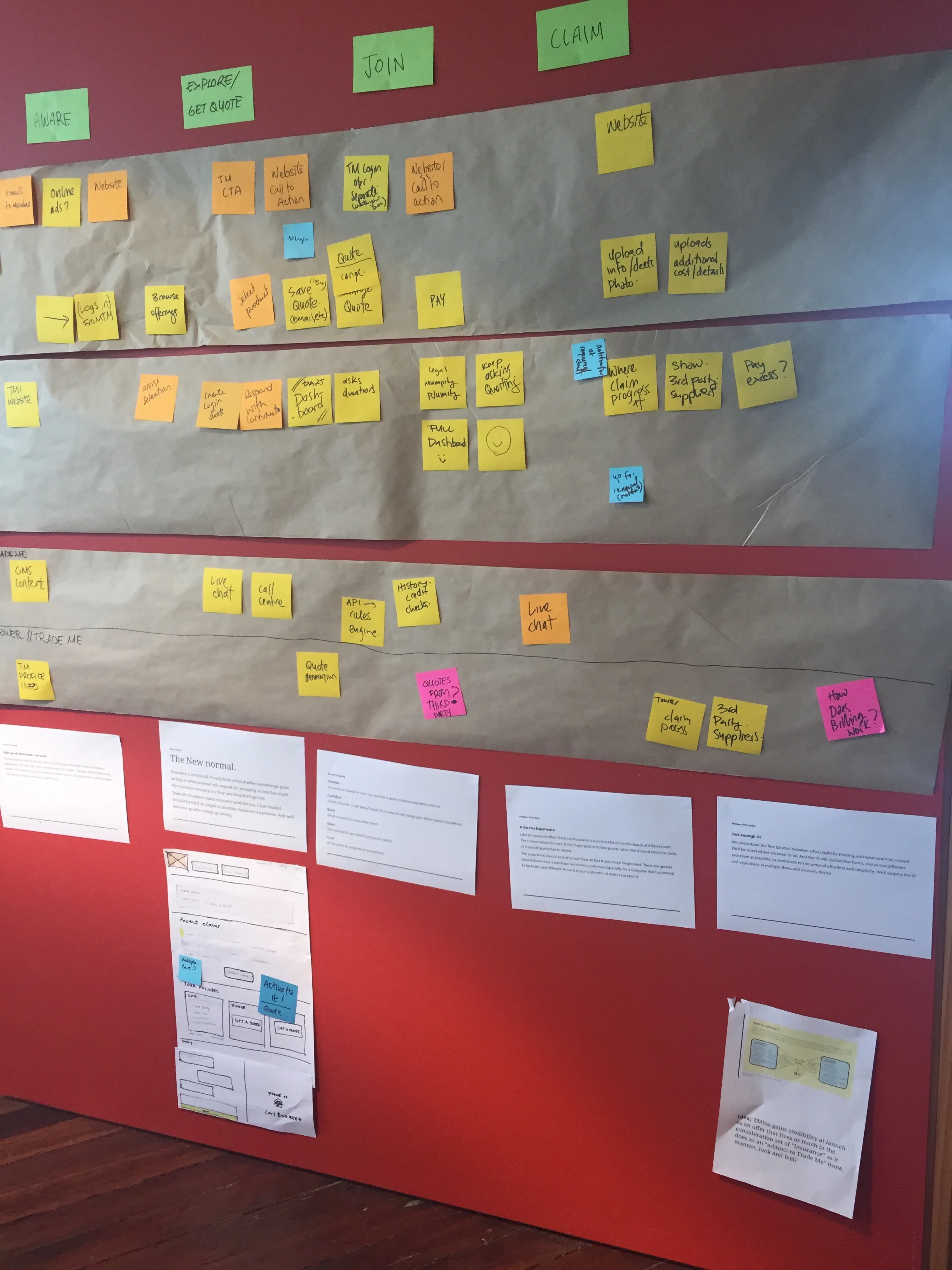 Using Service Design tools to understand the insurance business the client and the project team joined me in creating this rough-and-ready service design blueprint. This ensured that the client and the team were all on the same page regarding the working process and acted as a basis for the requirements for this project