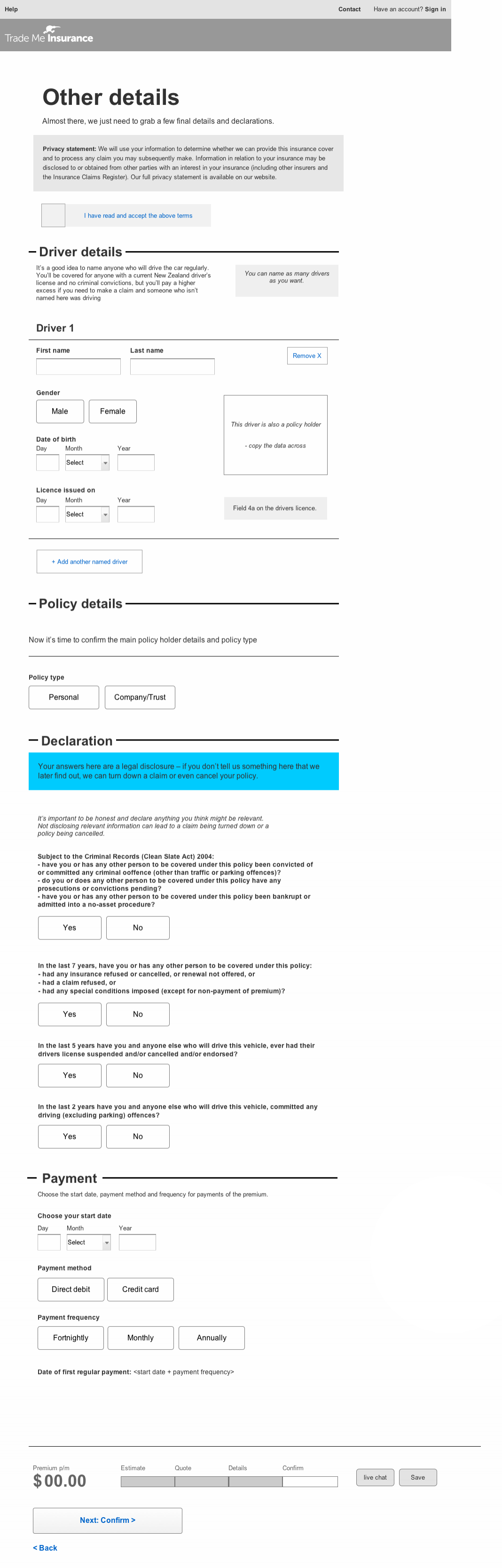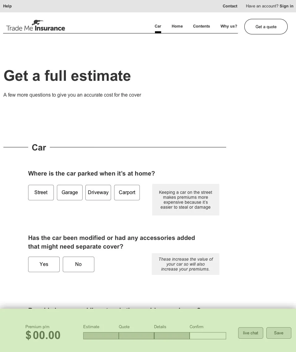 Trade Me Insurance was a newcomer to the insurance market. The goal was to take the uncertainty out of getting insured while working with a well established underwriter (complete with legacy systems).